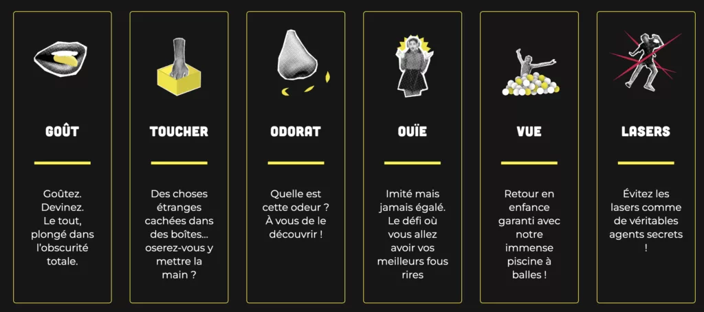 Au fil du parcours, vous devrez par exemple reconnaître des odeurs mystérieuses, goûter des aliments sans les voir, deviner des sons ou encore plonger vos mains dans des boîtes remplies d’objets surprenants. Certaines épreuves physiques comme la traversée d’un parcours de lasers viennent également pimenter l’aventure.