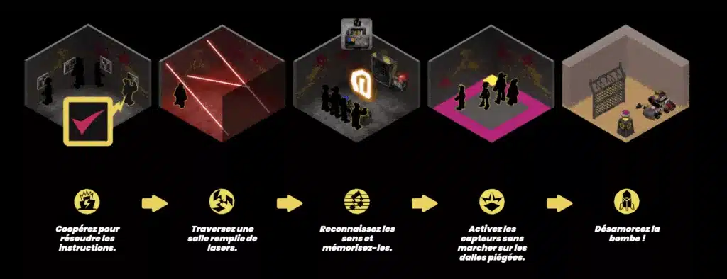 Durant environ 1 heure, traversez quatre épreuves de 10 minutes : évitez les lasers, mémorisez des sons, activez des capteurs sans déclencher de pièges et résolvez les instructions pour désamorcer la bombe. Le jeu est conçu pour les équipes de 2 à 6 participants, dès 7 ans, et convient aussi bien pour une sortie en famille, entre amis ou un team building original.