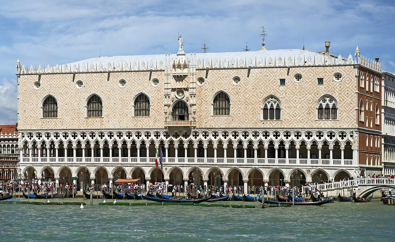 La façade donnant sur la lagune et la Piazzetta est célèbre pour son élégance et ses loggias ouvertes. À l’intérieur, la somptueuse Scala d’Oro mène aux appartements du Doge décorés de stucs et peintures. La salle du Grand Conseil, immense et richement ornée, abrite des œuvres majeures de Véronèse et du Tintoret.